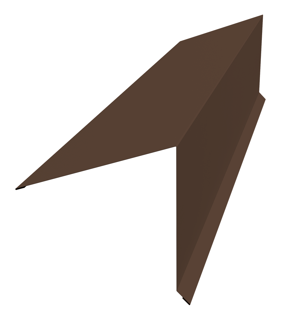 Планка конька односкатной кровли предназначена для защиты от попадания влаги, грязи в подкровельное пространство и от срыва листов порывами ветра, закрывая листы металлочерепицы или профнастила на коньке и наружных переломах кровли.
