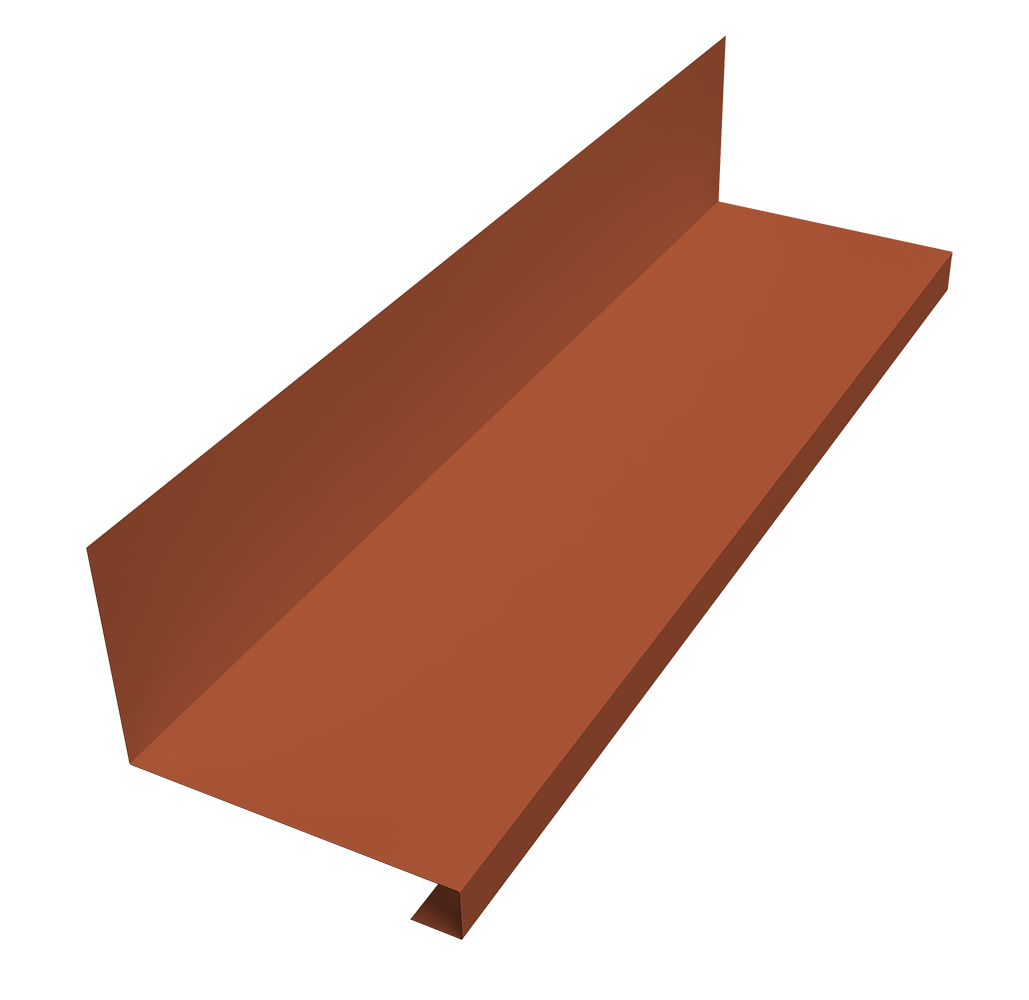 Планка устанавливается внизу кровельного материала на внутренней стороне трубы в паре с планкой примыкания верхней, защищая кровлю и фасад здания от проникновения воды и осадков. Производится из оцинкованной стали с защитным слоем, что позволяет увеличить срок ее службы.